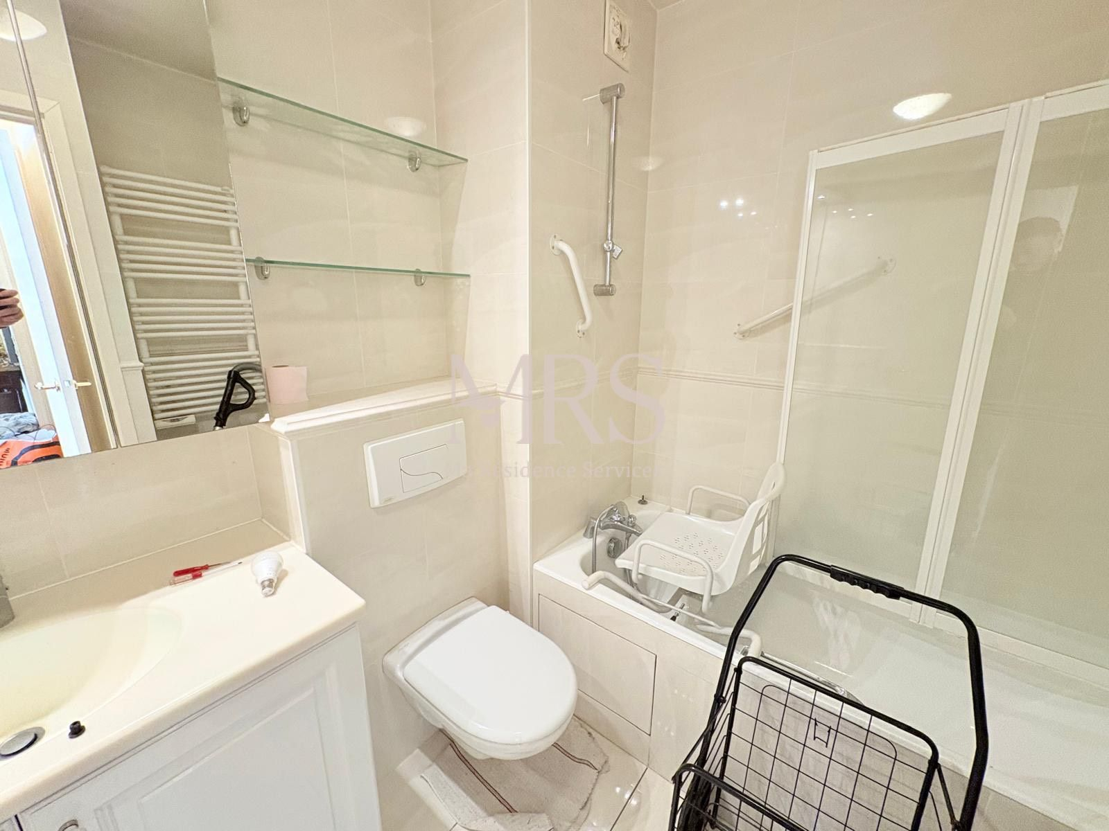RESIDENCE AVEC SERVICES PARIS 16ème, Rue Mirabeau dans une résidence avec services LES HESPERIDES, pour seniors autonomes et valides (sécurité 24h/24, restauration + nombreux autres services) en étage avec double ascenseur, agréable 2 pièces de 56.53 m² : entrée, séjour avec balcon, cuisine aménagée indépendante, une chambre avec placard et accès au balcon, une salle d'eau, WC séparés. Appartement à raffarichir.